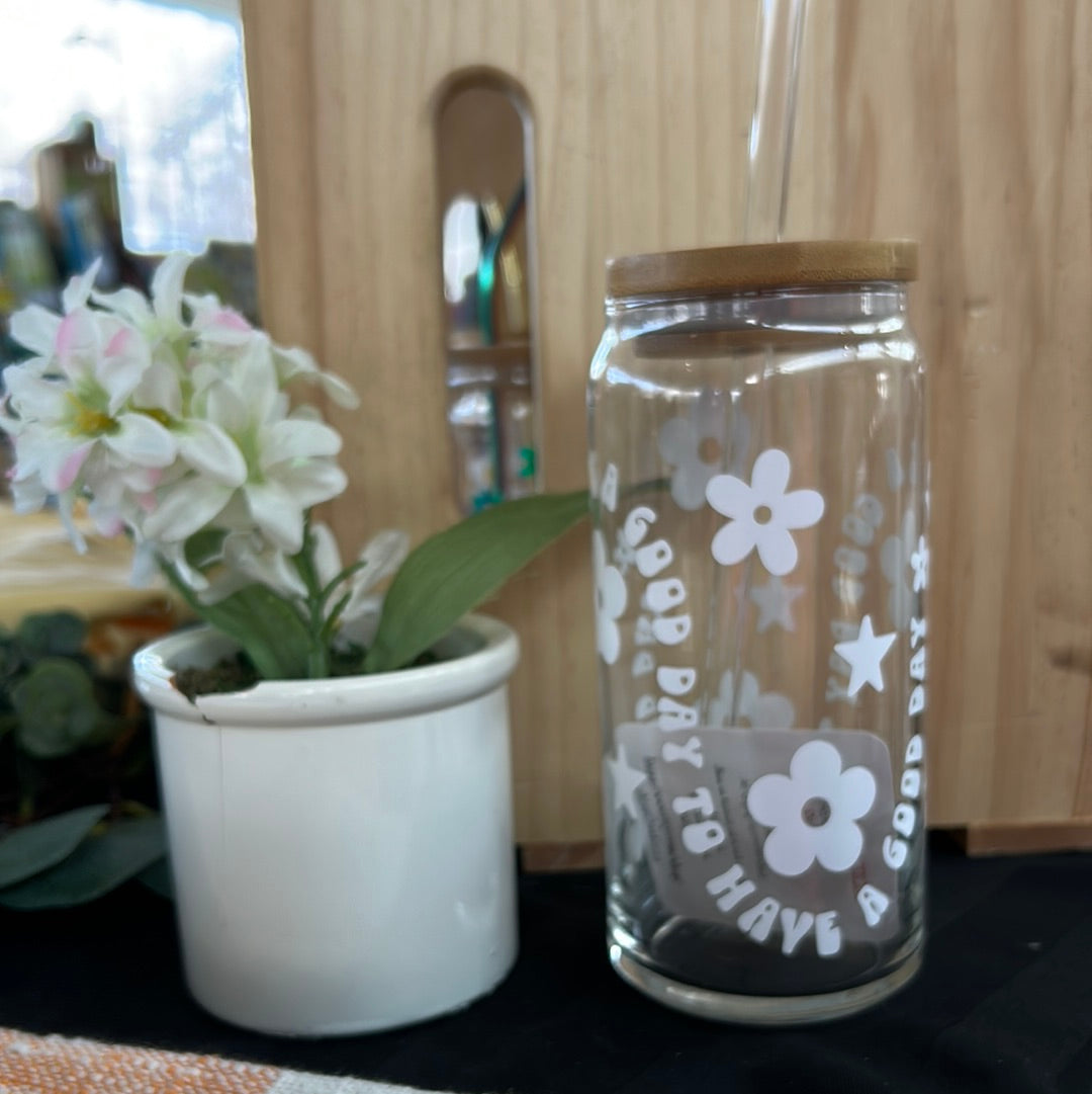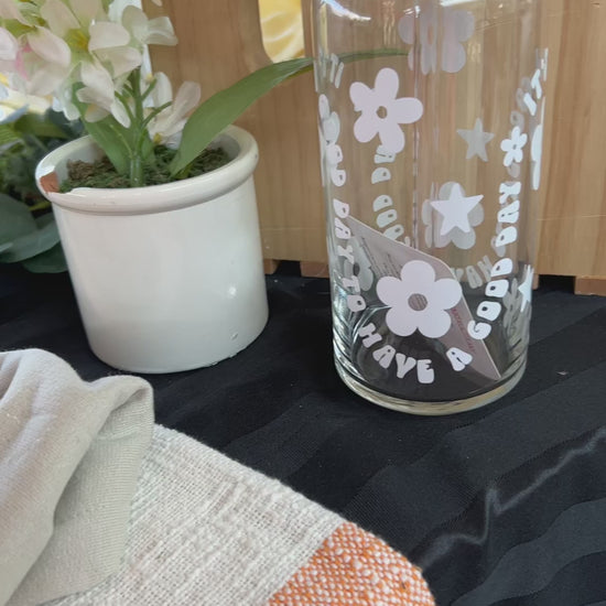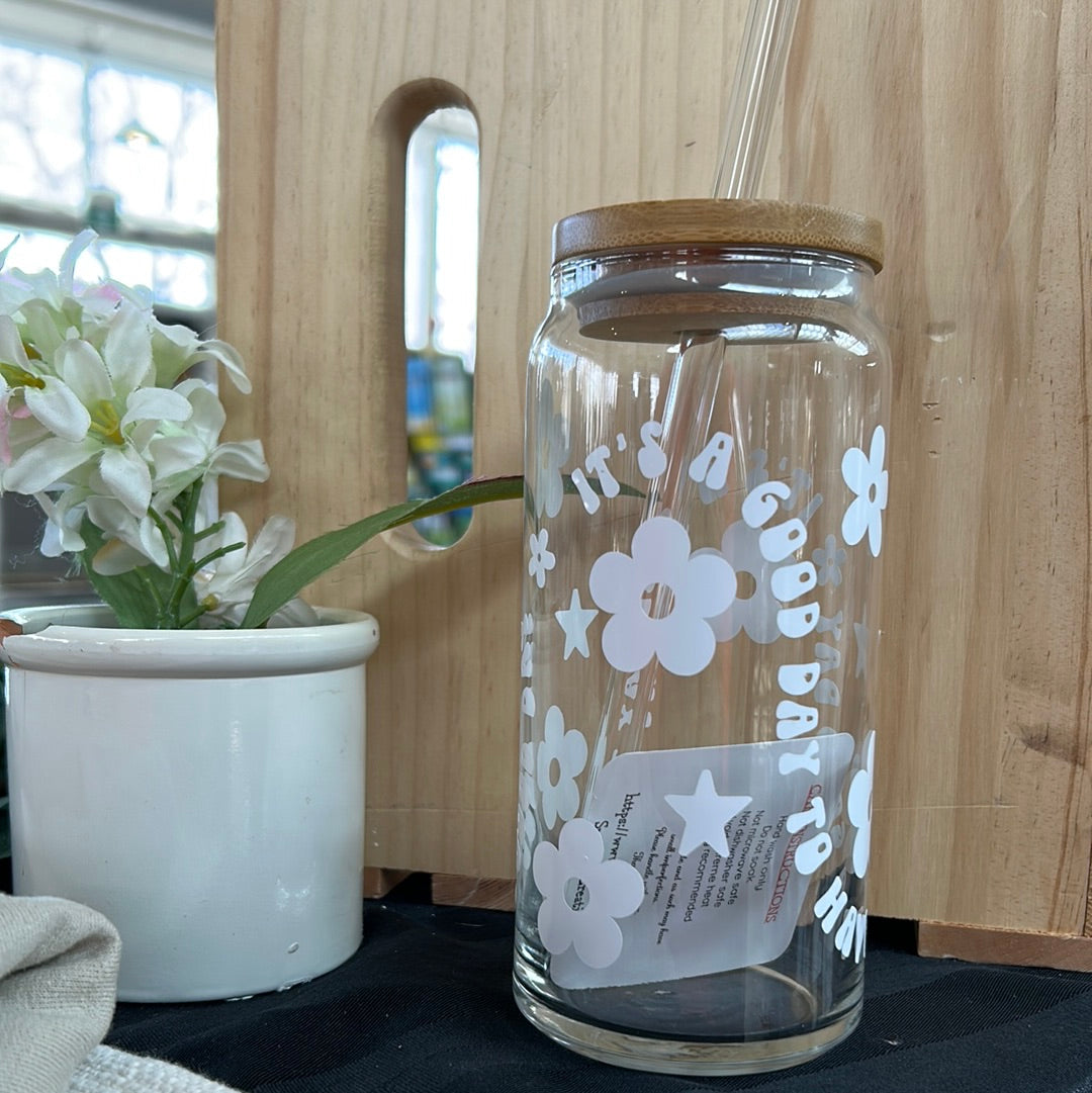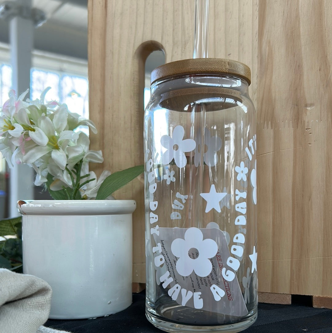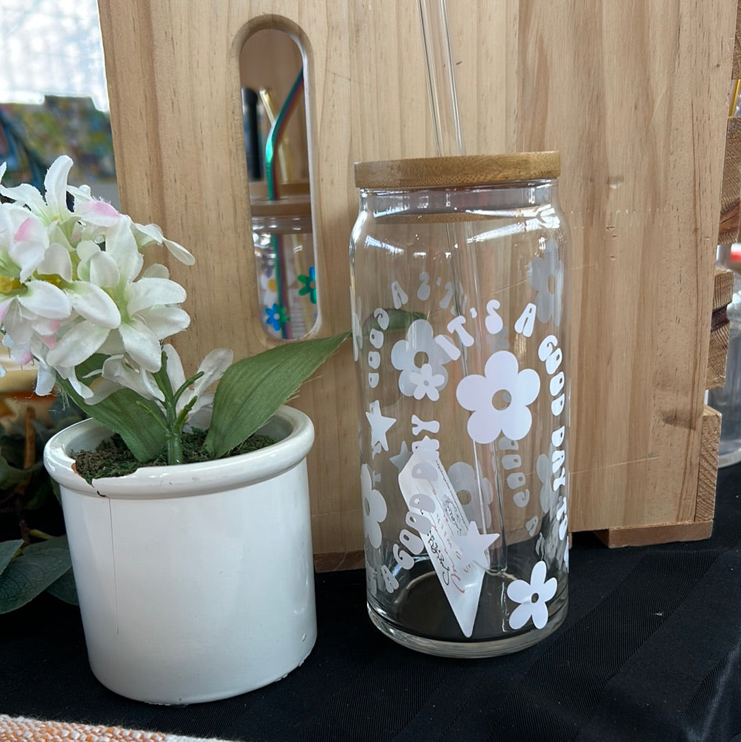 Each glass can is decorated with premium quality permanent vinyl. The vinyl is placed by hand which means not every glass will be lined up exactly the same. Cups are NOT sealed with epoxy.