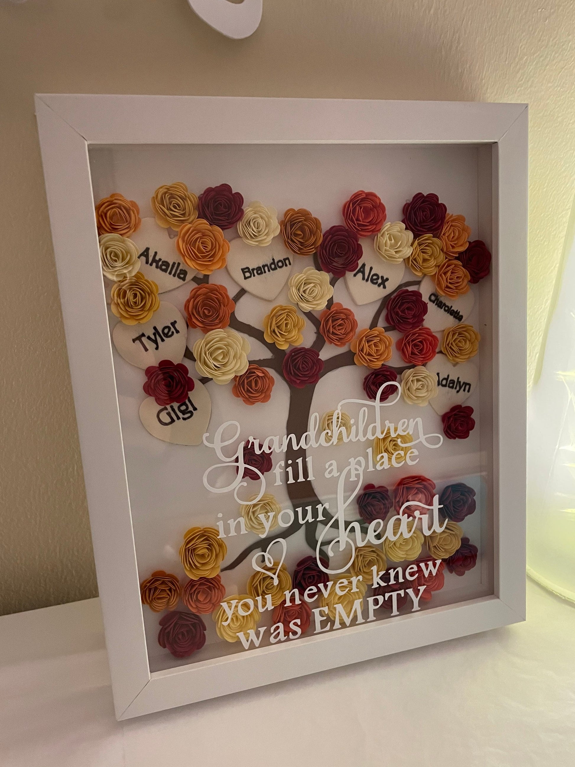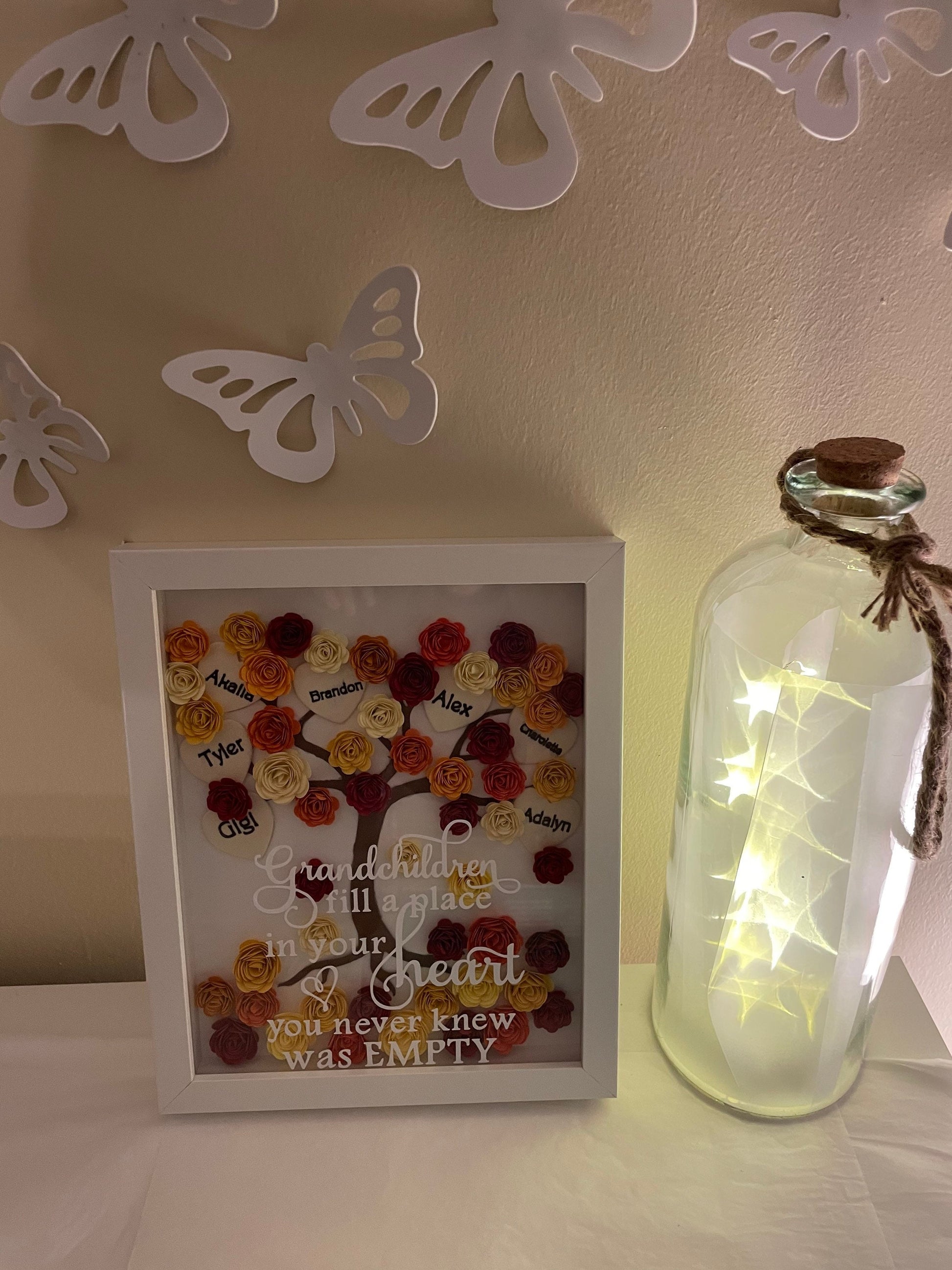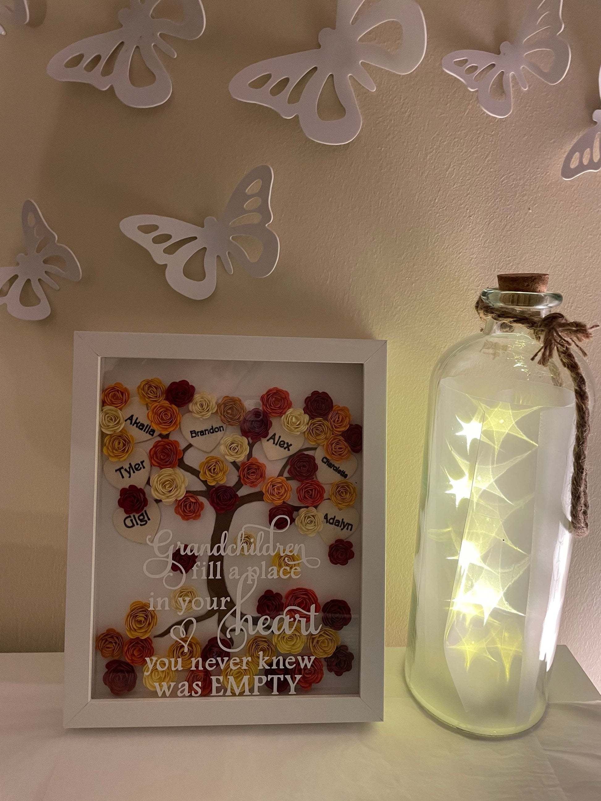 The frame is 8 X 10 inches and has a hook for hanging if you so desire, but it also has the option of sitting on its own. The glass top can be customized with your own text that is cut with choice of vinyl saying and colour. This frame also comes with customized wooden hearts, with each grandchild’s name on it!